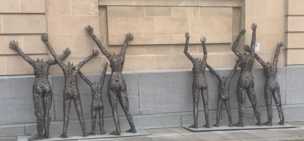 Congolese Sculptor who makes sculptures from casings and cartridges. Eight figures face the wall in a tribute to refugees. They also honor those turned away at the border. They are a tribute to victims of violence past and present.